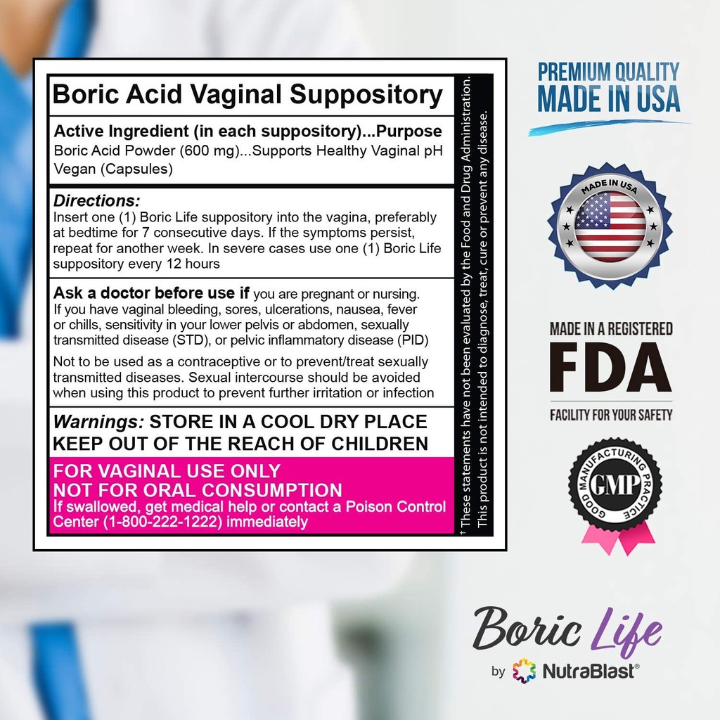 Boric acid has been used to treat vaginal infections for over 100 years. - The over the counter OTC NutraBlast pharmaceutical medical grade Feminine Boric Life helps support pain relief and irritation quickly and efficiently. In fact here is a full list of all the ingredients.